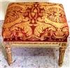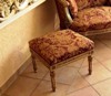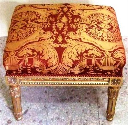 French Louis XVI style carved and gilded foot stool upholstered with luxury foliate red in gold damask fabric.