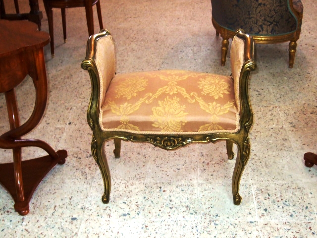 Delicate Louis XV style banquette / dresser arm chair, gilded with french gold foil, applied with dark green patina per client request, and upholstered with fine matching damask fabric. REF: A303
