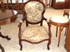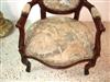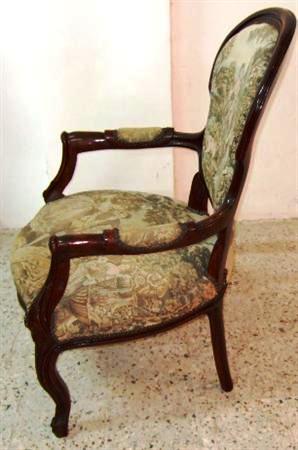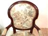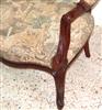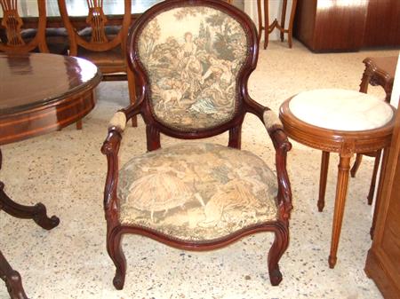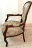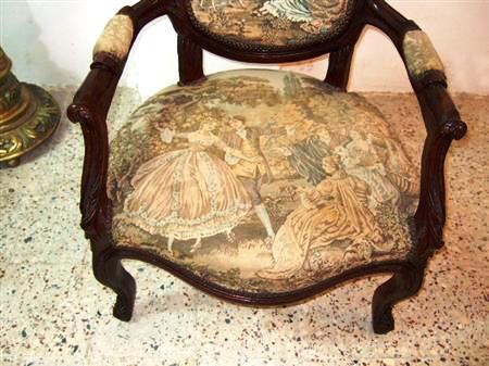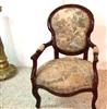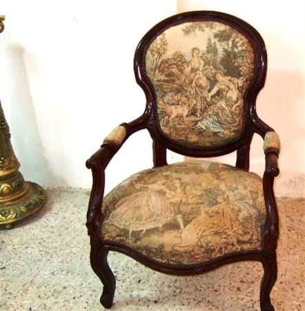 French Louis XV style arm chair finished in brown, upholstered with a romantic court scenes gobelin tapestry fabric. REF: A310