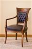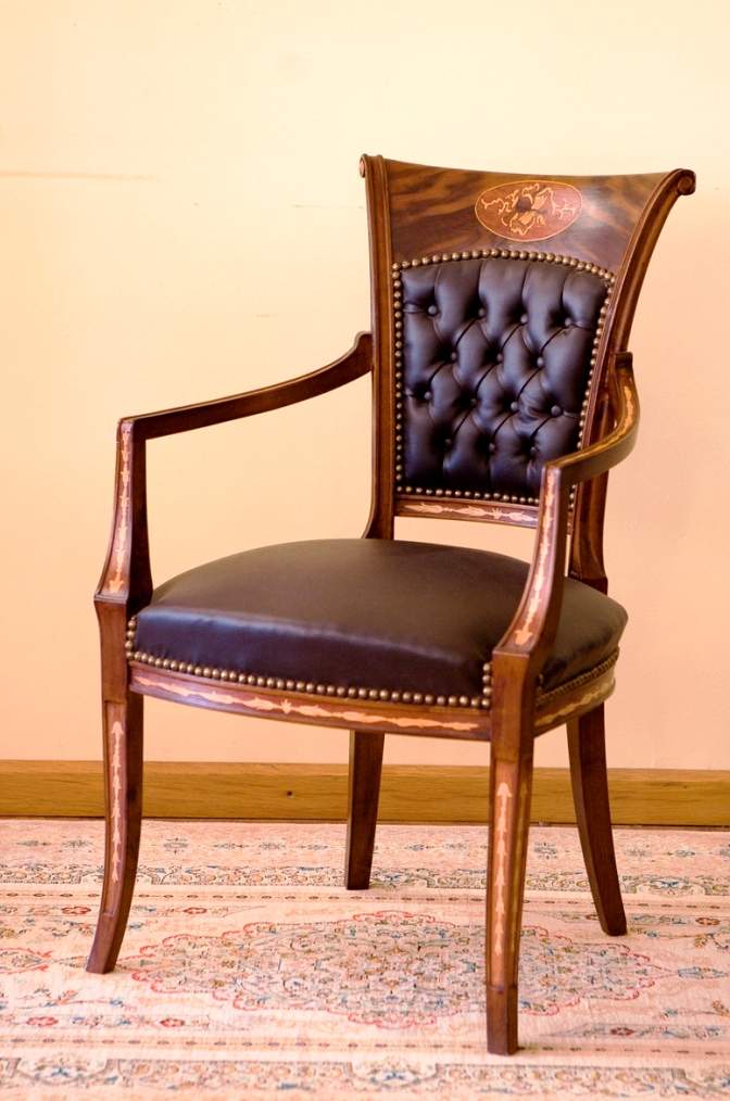 Beautiful and elegant Italian Empire style office arm chair upholstered with nailed leather capitoné style back and inlaid with finest veneers and marquetry, matt finish. REF: A321