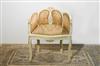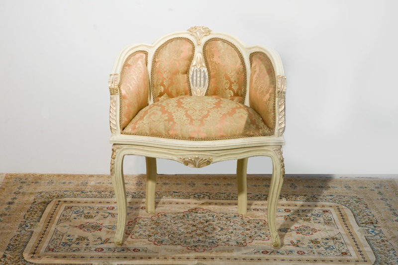 Louis XV style arm chair / dresser arm chair, painted in aged cream color applied with patina with matching colored gilded decoration plus a nice matching fabric. REF: A331
