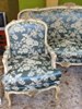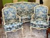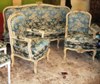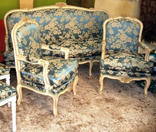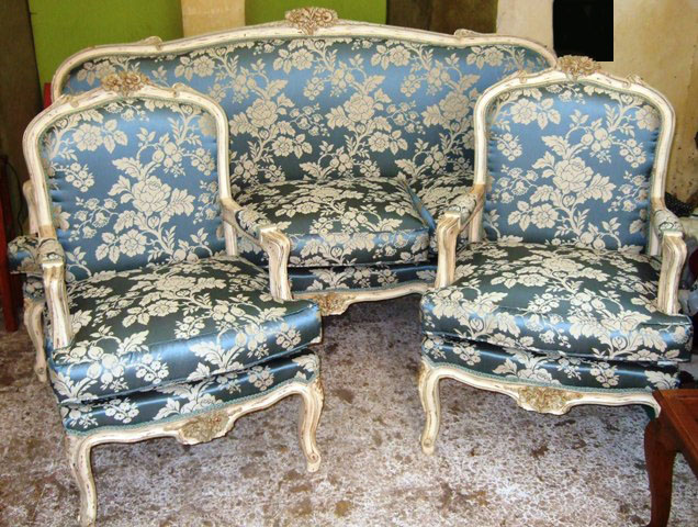 French Louis XV style salon set of a three seat sofa and two arm chairs, carved with delicate roses and finished in antique aged cream color and aged coloring on edges with scratches on surface to be in pristine look, upholstered with beautiful royal blue floral design demask fabric.