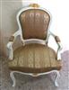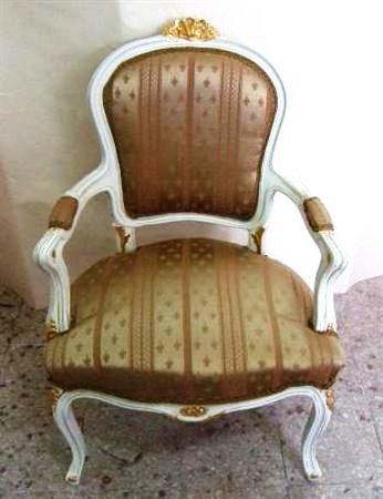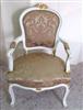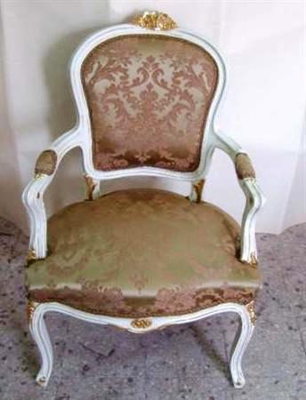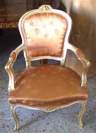 French Louis XV style carved arm chair upholstered with a damask fabric, gilded and silvered.