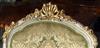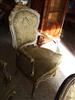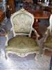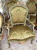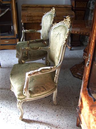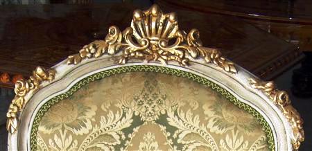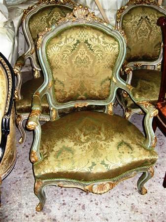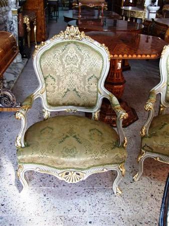 Royal French Louis XV arm chair produced in two degree finishing, green trianon color and creamy grey crackle finishing, carved with shell and foliate motifs, gilded with french gold foils on carvings and upholstered with an elegant green damask fabric.