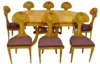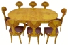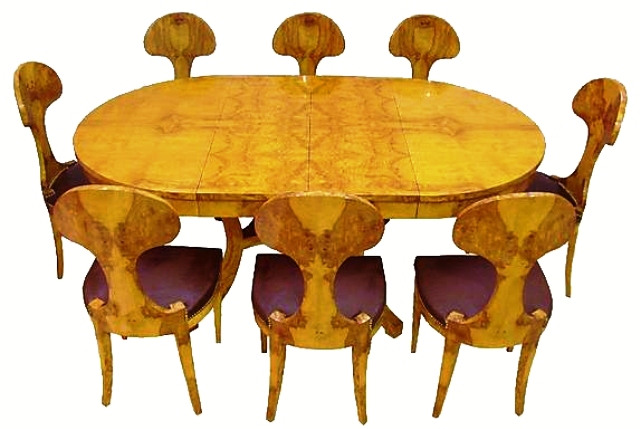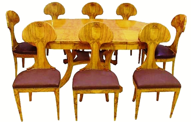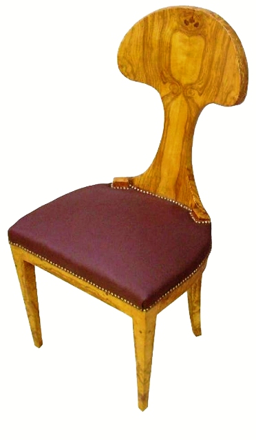Beautifully designed Biedermeier style dining chair / office use chair veneered with precious olive root veneer with a unique design back, and nailed upholstered seats. Part of a dining set, round extendable table.