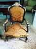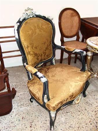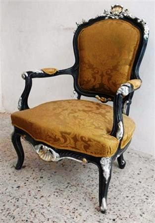 Elegant French Louis XV arm chair carved with shell and floral motifs, upholstered with royal damask fabric, painted in black color and silvered with french silver leaves on carvings - aged dusty silvering.
