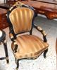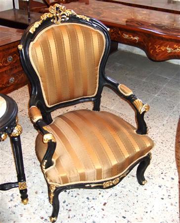 French Style Louis XV Arm Chair in black color & golden decorations Beautifully carved and upholstered with a very artistic striped fabric & gilded on edges with french gold leaves with a matching table per request.