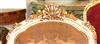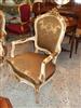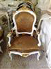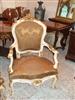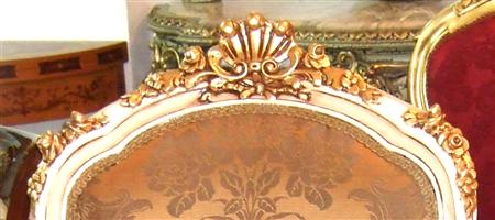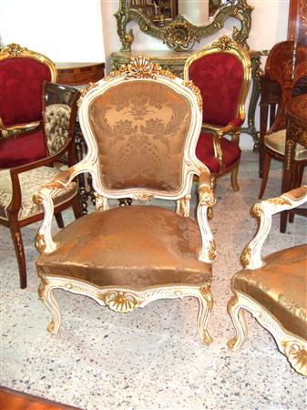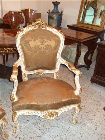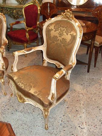 French Louis XV arm chair carved with floral motifs and shell, upholstered with a royal golen damask fabric painted in white with aged patina touches and gilded with french gold leaves. REF: A360