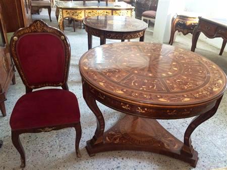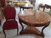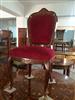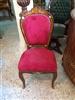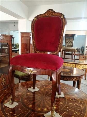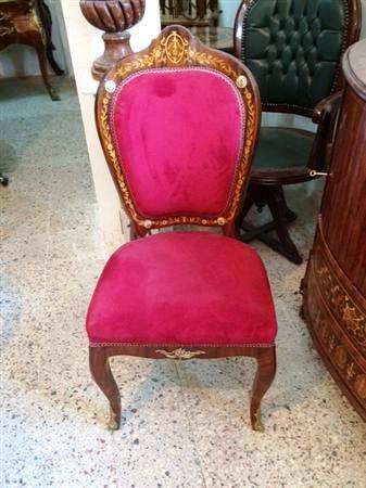 French Louis XV style office/desk chair, veneered, with marquetry design on the back, upholstered with red chenille fabric, ormolu ornamentation on back and seat front, ornamented with ormolu sabots on legs.