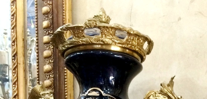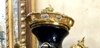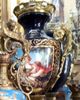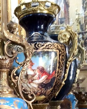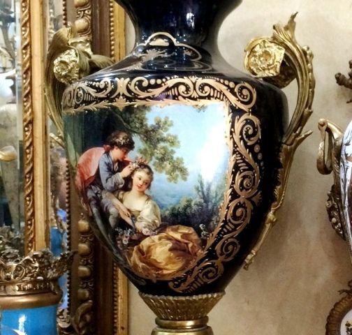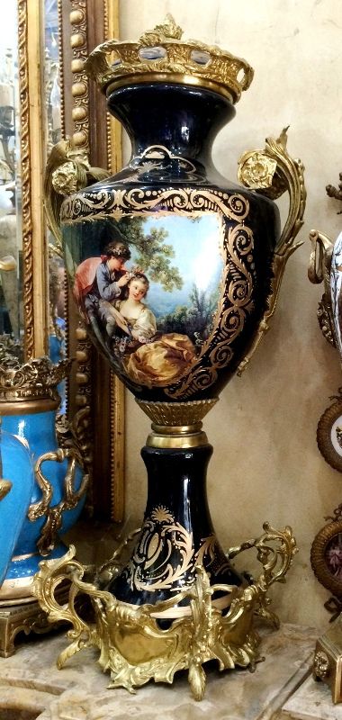 A pair of French style oviform shape cobalt blue-ground ormolu-mounted sevres porcelain vases and cover, painted with The Spring and The Autumn paintings, two of the Four Seasons paintings, after the painting of François Boucher, circa 1755, with natural landscapes scene to the reverse, inside an elaborate gilded scrollwork cartouche, the shoulder flanked by fine cast scrolled acanthus handles, with a waisted neck form emerge from the body enriched with gilt foliate pattern, surmounted with a pierced ormolu guilloche frieze, houses gilt foliate pattern domed lid with ormolu berried finial, raised on an ornamented conforming socle laid inside an ormolu rocaille style scrolled plinth.