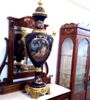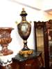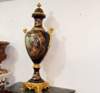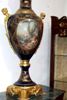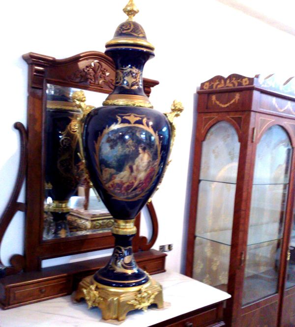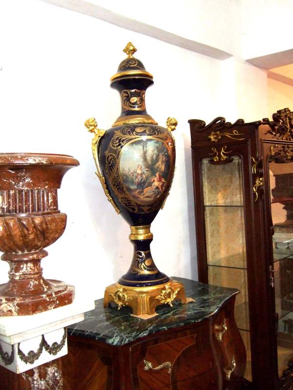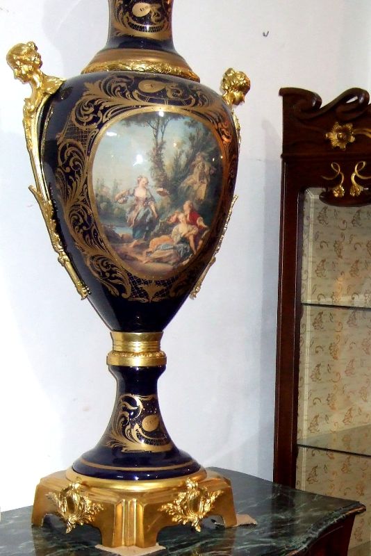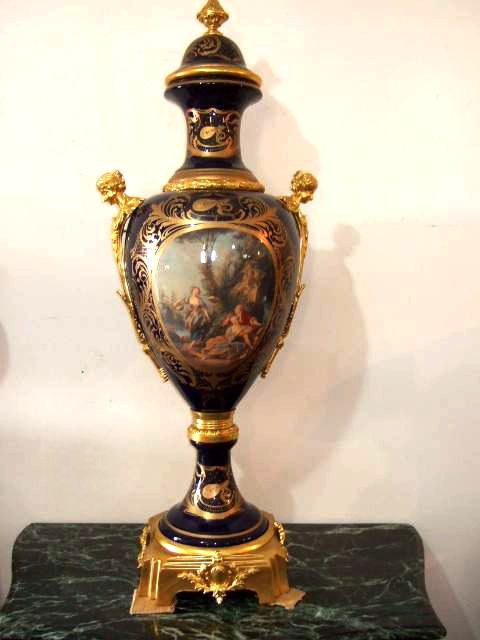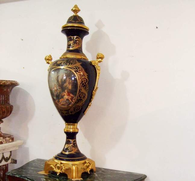 A cobalt blue-ground gilt ormolu-mounted sevres-style porcelain vase and cover, painted after the paintings of François Boucher, the front miniature shows part of the painting "Lovers in a Park, circa 1758" and the reverse depicts part of the painting "The Summer" painting, one of the-four-seasons paintings circa 1755", within a richly gilt scrollwork cartouche with musical trophy, the shoulder flanked by gilt-ormolu female Caryatids handles suspending berried laurel swags, with a waisted neck form enriched with gilt scrollwork and musical trophy, encircled with gilt-ormolu laurel wreath, surmounted with gilt scrollwork domed cover with a gilt ormolu pinecone finial, raised on an ornamented conforming socle and and gilt ormolu square shaped base with foliate cartouche.