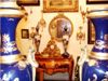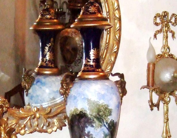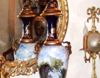 A pair of cobalt blue-ground ormolu-mounted sevres-style porcelain vases and cover of inverted teardrop tapering body form, painted with continuous view miniatures with scenes after the paintings of François Boucher, flanked to each side by ormolu ram heads with horns, with a cobalt-blue bottleneck form enriched with gilt foliate pattern, surmounted with a cobalt-blue gilt scrollwork domed lid with ormolu acorn finial, raised on a cobalt-blue ornamented conforming socle and circular foliate ormolu scrollwork bases.