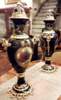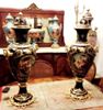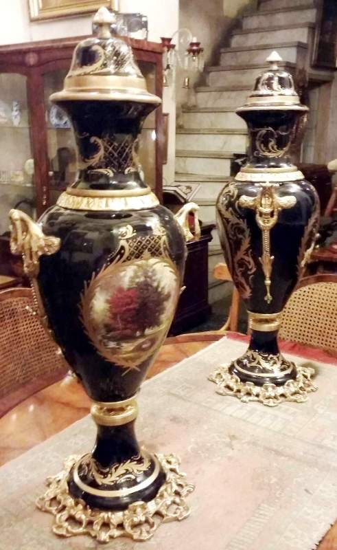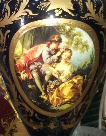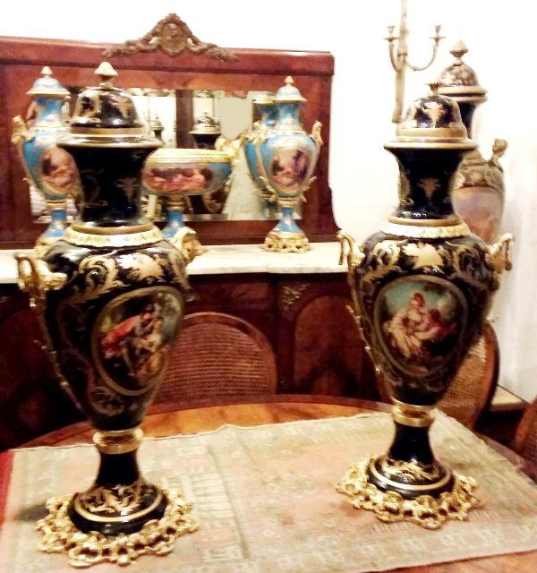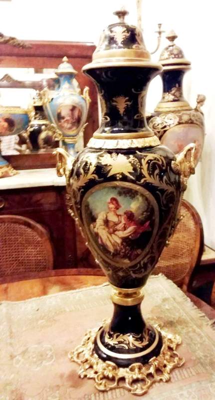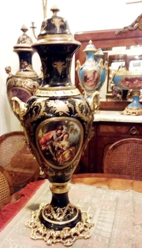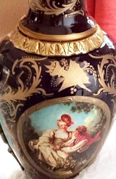 French style cobalt blue-ground pair of ormolu-mounted sevres porcelain vases and cover, painted with scenes after the paintings of François Boucher, with natural landscapes scenes to the reverse, within a gilt seeded band inside richly gilt tooled scrollwork cartouche, the shoulder flanked by upright ormolu acanthus-scroll handles suspending laurel swags rings, with a waisted neck form encircled with engraved ormolu band and enriched with gilt foliate pattern, surmounted with gilt foliate pattern domed lid with ormolu pinecone finial, raised on an ornamented conforming socle and circular foliate gilt ormolu scrollwork splayed base.