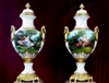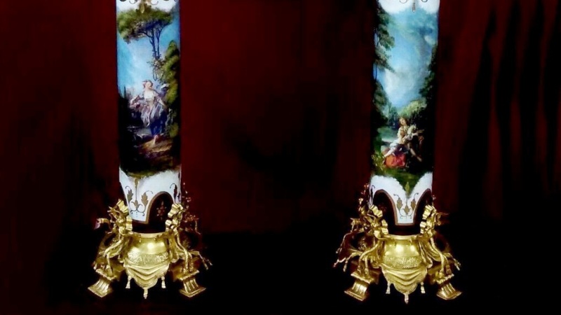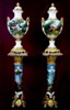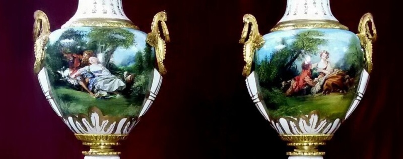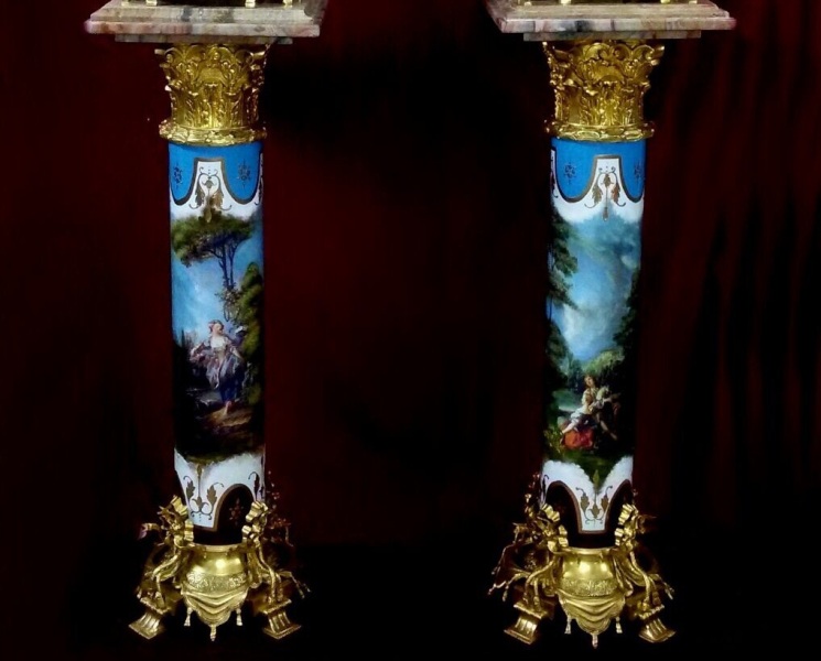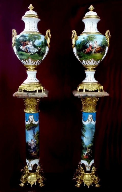 The pair of vase rest on two porcelain pedestals painted after Boucher, crowned with corinthian roman style ormolu capital put down on an exceptional gilt ormolu base finely cast with a foliate guilloche running border framed by exuberant swags and ribbons.