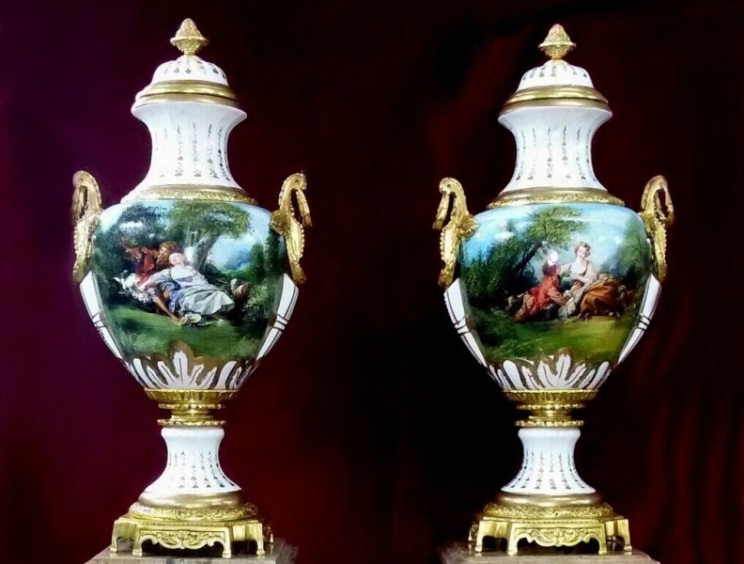 A fine pair of ormolu-mounted white ground sevres-style porcelain vases and cover on ormolu porcelain pedestal, painted with scenes of Francois Boucher paintings, the shoulder flanked by upright ormolu winged acanthus-scroll handles suspending laurel swag rings elongated with raised body miniature, with a waisted neck form encircled with engraved ormolu collar and surmounted with domed lid terminate with ormolu pinecone finial, the cover, neck and socle are ornamented with gilt oeil-de-perdrix, raised on a conforming socle encircled with engraved ormolu collar above engraved ormolu square paneled canted plinth on eight feet.