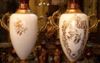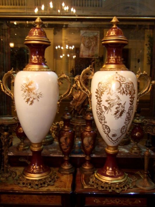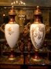 A fine pair of white-ground gilt ormolu-mounted sevres-style porcelain vases and cover, with enameled white body ornamented with fine gilt cartouche of tooled scrollwork and animals. The lid, neck and socle are in dark red, ornamented with gilt foliate scrollwork, the shoulders of each are mounted with finely scrolled Rocaille styles handles with putto, the neck encircled with gilt-ormolu laurel wreath, surmounted with domed lid with a gilt-ormolu pine cone finial, raised on an ornamented conforming socle and foliate ormolu scrollwork splayed bases.