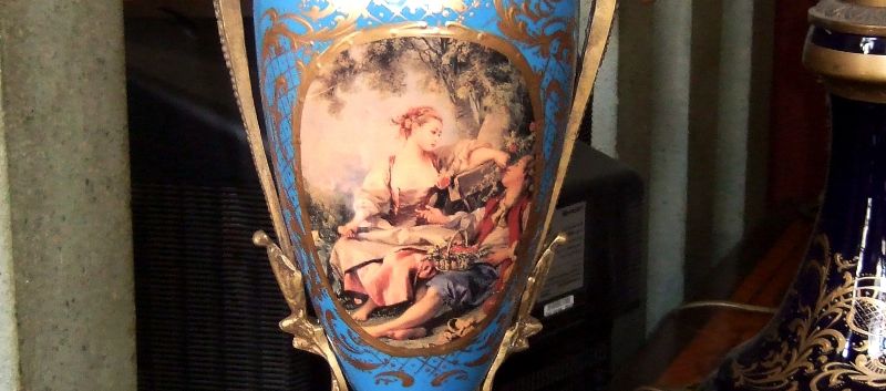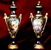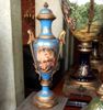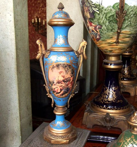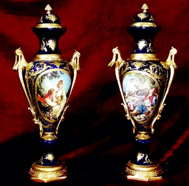 Ormolu-mounted sevres-style porcelain vases and cover, turquoise ground and cobalt blue ground, painted in miniatures after Boucher with amorous couples within gilt scrollwork cartouche, the shoulder flanked by upright ormolu acanthus-scroll handles suspending laurel swag rings, with a waisted neck form enriched with gilt foliate pattern, surmounted with gilt ornate domed lid with ormolu pinecone finial, raised on a flared spout above a gilt ornamented conforming socle above ormolu octagonal laurel-wreathed base.
